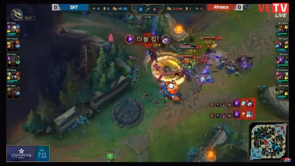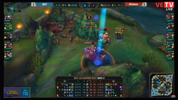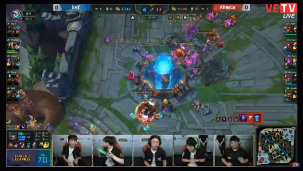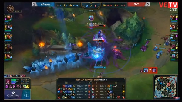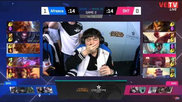 Nhanh chóng lấy được Baron, tại phút thứ 27 không có gì bất ngờ khi Afreeca lấy được nhà lính đầu tiên trong trận đấu, và mọi thứ dường như đang đi rất đúng quỹ đạo của đội tuyển này. Tuy nhiên… ngay sau khi AFs ăn xong con Baron thứ 5, Faker tỏa sáng với 2 cú khiêu khích 4 thần sầu, giúp SKT lấy 1 đổi 5, đưa toàn bộ các thành viên AFs lên bảng đếm số, rút ngắn khoảng cách mạng và tiền một cách rất đáng kể.