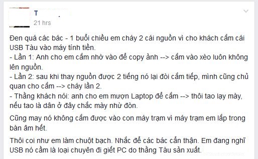 "Đen quá các bác - 1 buổi chiều em cháy 2 cái nguồn vì cho khách cắm cái USB Tàu vào máy tính tiền.