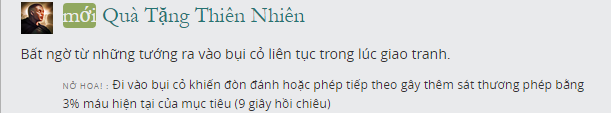 Nếu bạn chơi đường trên và muốn trao đổi chiêu thức thật nhiều với đối thủ, bạn nên chọn Quà Tặng Thiên Nhiên và tận dụng 3 bụi cỏ sẵn có. Thời gian hồi 9 giây là tương đối phù hợp cho việc trao đổi chiêu thức liên tục và cấu rỉa máu.