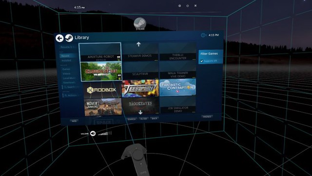 HTC Vive: Ơn trời HTC hợp tác cùng với Valve và với hệ thống Steam cực mạnh của mình thì Valve đã cùng với HTC tạo nên một sản phẩm mang tên SteamVR và điều đó có nghĩa là những thành viên của hệ thống Steam sẽ vừa lưu trữ những tựa game bình thường trên máy tính và vừa có thể sử dụng để chơi những tựa game trong môi trường thực tế ảo luôn, thật sự là quá tiện lợi đó mà. Giao diện của phần mềm Steam trên HTC Vive cũng khá là giống với giao diện Big Picture Mode của phiên bản Steam trên máy tính và khá dễ dàng để làm quen.