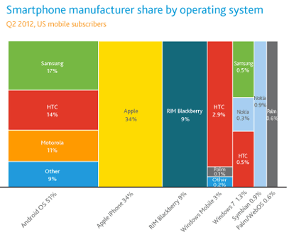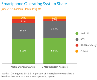 Bên cạnh đó, hệ điều hành Android vẫn tiếp tục chứng tỏ vị thế dẫn đầu khi chiếm tỷ lệ 51,8% người dùng smartphone tại Mỹ và 54,6% số người mua điện thoại trong 3 tháng qua. Kết quả này đến từ phần lớn là do chiếc siêu phẩm Galaxy S III đã ra mắt trong quý vừa rồi đạt được doanh số ấn tượng.