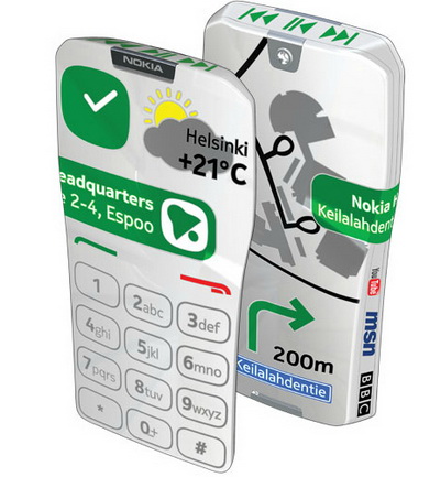 Hãng Nokia vừa ra mắt 1 mẫu concept điện thoại với màn hình cảm ứng phủ toàn bộ bề mặt của thiết bị. Màn hình sẽ được thay đổi tùy theo ứng dụng mà người dùng lựa chọn. Ví dụ nếu bạn lựa chọn ứng dụng bản đồ, các phím bấm ảo sẽ tự động biến mất để toàn bộ màn hình sẽ hiển thị chi tiết, cận cảnh nhất về bản đồ cho bạn. Đồng thời, bản đồ sẽ "tràn" sang cả mặt sau của điện thoại để bạn có thể xem chi tiết hơn.