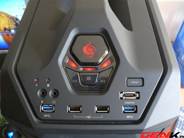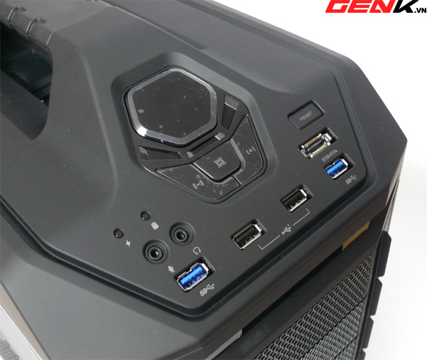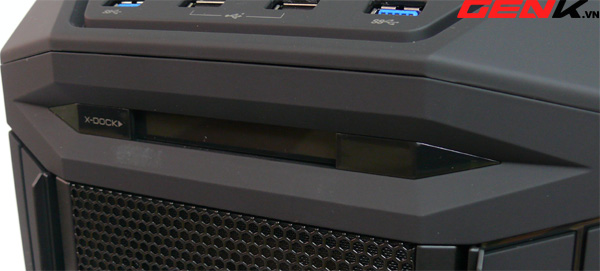 Bảng điều khiển cũng được thiết kế “ngầu” miễn chê, ăn đứt đa số thùng máy trên thị trường hiện nay. Thùng máy được trang bị đầy đủ các cổng kết nối ngoại vi từ phổ thông đến “thời thượng”: 2x USB 2.0; 2x USB 3.0; 1x eSATA; Mic + Headphone. Điểm đặc biệt là sự hiện diện của nút bật/tắt LED đỏ của 2 quạt mặt trước và 2 nút điều tốc quạt với 6 mức độ. Bạn đọc sẽ rõ hơn về các nút này khi xem hình ảnh thùng máy đang hoạt động. Ngoài ra, ngay bên dưới bảng điều khiển, Cooler Master còn thiết kế 1 X-DOCK để cắm nóng ổ SSD 2,5 inch.