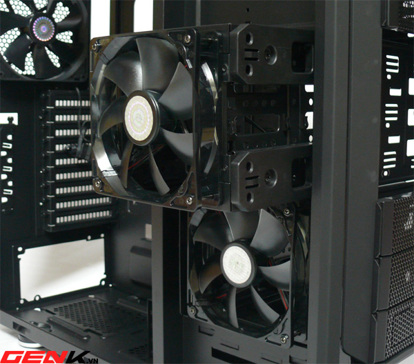 Một điểm rất khác biệt của Storm Trooper so với các thùng máy khác chính là 2 khoang ổ cứng 3,5 inch và 2 quạt tản nhiệt cho ổ cứng. Theo nguyên tắc, quạt tản nhiệt cho ổ cứng được thiết kế hút gió vào từ mặt trước, vừa làm mát ổ cứng vừa tận dụng để lưu thông khí làm mát toàn bộ không gian bên trong.