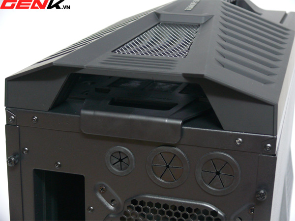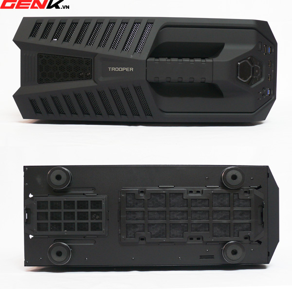 Có thể nói, phần thu hút nhất của Storm Trooper chính là phía nóc của thùng máy. Các khe lưới thông gió chĩa về 2 bên trông như bộ phận tản nhiệt của một phi cơ, che lưới lọc bụi và quạt 200 mm bên dưới. Ngoài ra còn có một tay cầm bọc cao su rất tiện lợi ở phía trước, mặt dưới tay cầm lại có thêm một lớp đệm cao su cực kì êm tay. Ở phía sau của nóc case còn có một hốc nhỏ khá vững vàng, cũng có chức năng như một tay cầm. 2 chiếc tay cầm này giúp đỡ tôi rất nhiều trong quá trình di chuyển, chụp ảnh. Nhờ có chúng, quá trình thực hiện bài viết của tôi còn nhẹ nhàng hơn các sản phẩm mid-tower khác nhẹ cân hơn.