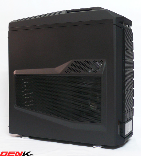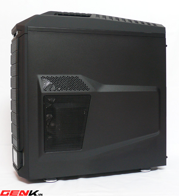Xoay ngang thùng máy ra một chút, chúng ta có thể thấy một khe lưới lớn và dài chạy dọc phần hông phải. Người dùng có thể gắn thêm 2 quạt 120 mm ở vị trí này, chĩa thằng vào vị trí của card đồ họa bên trong để làm mát. Tuy nhiên theo cá nhân tôi, khả năng tản nhiệt của Storm Trooper về tổng thể đã là quá tốt nên việc gắn thêm 2 quạt này là hoàn toàn không cần thiết, thậm chí còn làm tăng tiếng ồn và bụi.