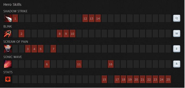 Bạn nên tăng tối đa vào kĩ năng Scream of Pain trước để dễ dàng farm và dồn sát thương tức thời hơn. Shadow Strike và Blink nên được tăng một điểm lúc đầu và tăng tối đa khi về late game (bạn nên tăng Blink tối đa trước Shadow Strike để di chuyển link hoạt hơn).