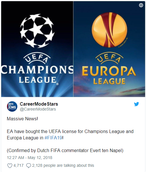 Theo nguồn tin rò rỉ từ tạp chí CareerModeStars, EA Games đã đàm phán thành công với liên đoàn bóng đá Châu Âu để sở hữu bản quyền hình ảnh của hai giải đấu UEFA Champions League và Europa League. Như vậy, sau 10 năm bị PES “nẫng tay trên”, FIFA đã tung đòn quyết định để hạ “knock out” đối thủ.