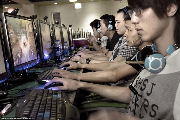 Một nhóm thanh niên đang tập trung đánh điện tử ở quán cafe Internet.