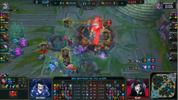 Giai đoạn đầu của ván đấu diễn ra khá cân bằng với cả hai đội, chỉ đến khi tới giai đoạn giữa trận đấu, sự khác biệt mới có nghiêng về phía đội tuyển SUP khi GAM liên tục mắc lỗi di chuyển khiến họ bị buộc phải rơi vào những tình huống giao tranh trong những vị trí bất lợi, đặc biệt là khi SUP có một Rumble cực “xanh” trong đội hình. GAM đang thực sự bế tắc khi SUP hiện đang dẫn trước về những lợi thế.