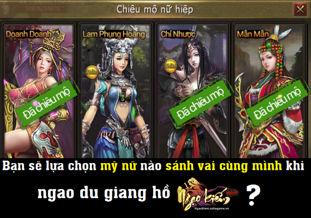 Tham gia vào Ngạo Kiếm Mobile, các fan kiếm hiệp sẽ luôn có được cơ duyên kỳ ngộ với những mỹ nhân tuyệt sắc, những nữ hiệp sở hữu võ công thượng thừa. Và khi thuyết phục được các nữ hiệp xinh đẹp ấy đồng ý đi theo phò tá mình, con đường bôn tẩu giang hồ của bạn từ nay sẽ không còn "Vạn bước độc hành" nữa!