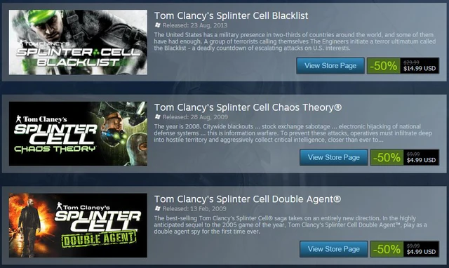 Những game thủ hâm mộ chàng điệp viên siêu hạng Sam Fisher, những phiên bản Splinter Cell từ Chaos Theory, Double Agent hay Blacklist có giá từ 4,99 đến 15 USD, nghĩa là chỉ từ 100 đến 300 nghìn Đồng. Chi tiết các bạn có thể theo dõi cụ thể tại trang web của Steam tại địa chỉ http://store.steampowered.com/sale/tom-clancy/