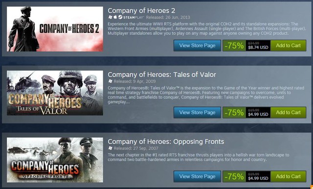 Trong khi đó series game chiến thuật đỉnh cao Company of Heroes cũng có mức giá tương tự: http://store.steampowered.com/sale/company-of-heroes/
