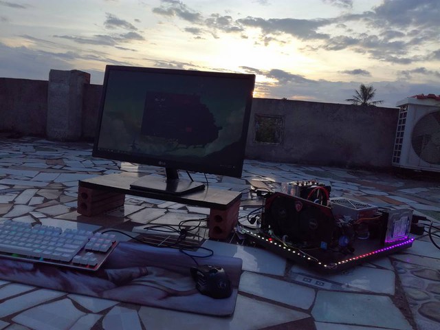 Rất nhiều game thủ đã cảm thấy thích thú vì setup quá độc đáo, dùng hẳn... hai hòn gạch và một tấm gỗ để kê màn hình máy tính, và nền trời hoàng hôn tuyệt đẹp ở phía sau. Thế nhưng thắc mắc chung của những game thủ, và cũng là cả của chúng tôi nữa, đó là sẽ ra sao nếu bất chợt trời đổ cơn mưa (?!)