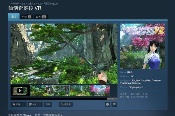 Hiện tại, Tiên Kiếm Kỳ Hiệp Truyện VR đã được đưa lên trên Steam, nhưng tất nhiên chỉ được mở dành riêng cho khu vực Trung Quốc mà thôi. Đây cũng là sản phẩm game Tiên Kiếm Kỳ Hiệp Truyện đầu tiên được phát triển cho công nghệ kính thực tế ảo VR.